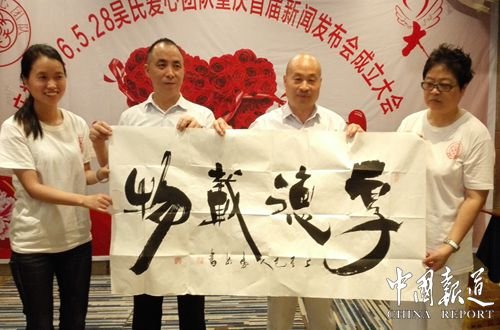 中囯吴氏工商联合会会长﹑中国吴氏文化产业联盟负责人﹑无锡市吴氏春秋信息科技有限公司董事长﹑云维他中国代表处负责人吴胤悦为重庆吴氏爱心团队暨吴氏爱心艺术团成立新闻发布会表示祝贺并表示将以实际行动继续传承爱心支持重庆吴氏爱心团队。香港秦伯基金会会长现场赠送书法及中国环保大气环保网吴志泉赠送多的副书法作品为爱助兴。