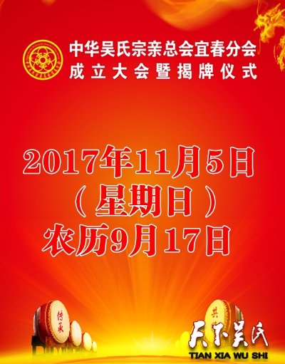天下吴氏讯(特约采编 吴蜀丰 吴程)2017年11月5号上午9点整(星期日)农历9月17日中华吴氏宗亲总会宜春分会(宜春氏三阳吴氏祠堂)揭牌仪式谨邀您参加!期待你的光临指导!参会报名联系人 吴江 18007958768