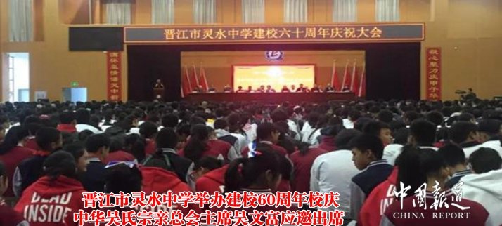 中国报道讯(记者吴蜀丰)欣逢盛世、万物争荣。日前,灵水中学建校60周年庆祝活动盛大举行。校庆当日,彩旗飘扬、鼓乐喧天,到处呈现出一派热闹、欢腾的景象。出席庆典大会的领导及嘉宾有:原泉州政协主席吴共和、原晋江市政协主席王恭庭、晋江市副市长黄少伟、安溪县副县长吴志朴、灵源街道办事处主任苏振发、中华吴氏宗亲总会主席、罗山灵源新塘侨联主席吴文富等领导及广大乡贤、社会各界人士、历届校友共五百多人齐聚灵中,与全校师生同庆灵水中学建校60周年,一起回首灵水中学六十年来的风雨沧桑,畅谈灵水中学未来的发展愿景!