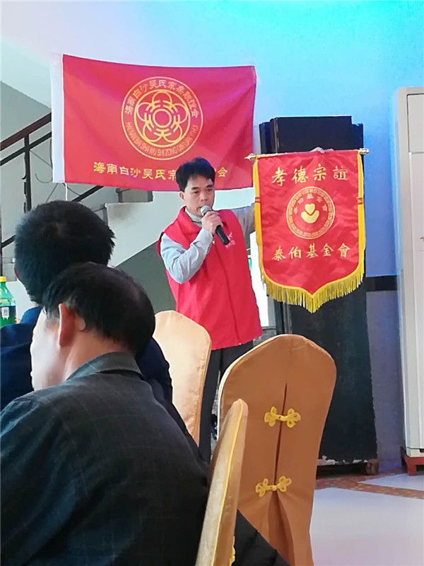 吴伟富宗长当选会长后作了热情洋溢的发言,他说:海南省白沙黎族自治县有吴氏宗亲3000多人,大家都期待成立一个吴氏宗亲组织,成立宗亲联谊会筹备委员会仅半年这么短的时间里,宗亲联谊会就能够顺利成立,这正是大家团结奉献、辛勤努力、鼎力支持的结果。今天,海南白沙吴氏宗亲联谊会成立终于正式成立了,这是具有里程碑意义的大喜事。让我们白沙黎族自治县所有吴氏宗亲从这个新起点出发,精诚团结,心心相印,以发展经济带动联谊,以传承泰伯至德文化弘扬祖德,以扶贫济困促进社会和谐,经信息资源与天下吴氏共享,共同把吴氏宗亲事业做大做好。(撰稿吴昌禄、吴伟富)