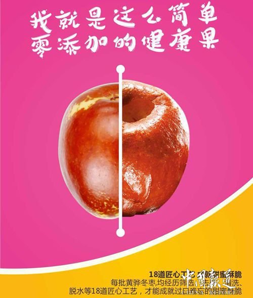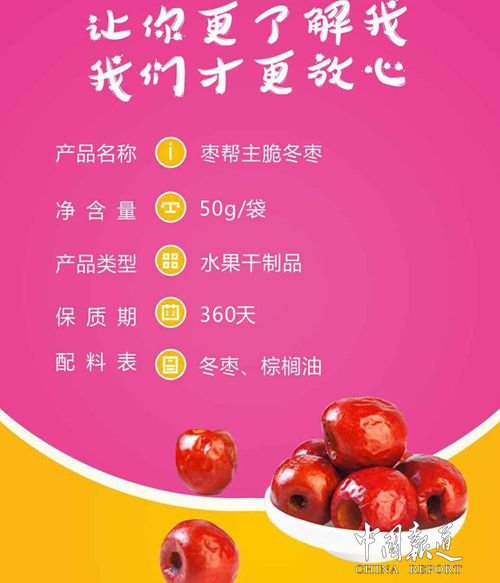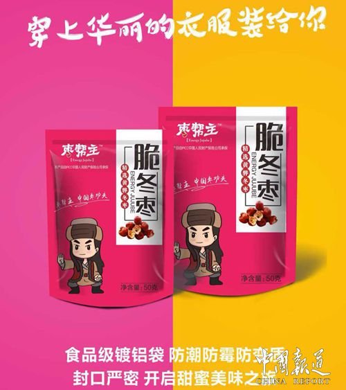 枣帮主脆冬枣,以黄骅优质鲜冬枣为原料,采用高科技工艺加工制成,不含任何添加剂,保留了鲜冬枣原有的营养,且口感更加酥脆香甜,食后回味无穷,是高档的健康食品。冬枣含糖量适中,味美可口,具有清理肠胃,有助于消化之功效,因此是美容和减肥的佳品。