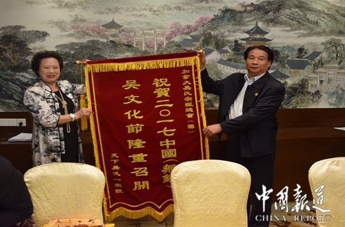 美国龙峰文化基金会副主席、大中华区域主席、美国龙峰文化有限公司执行总裁吴映辉代表加拿大宗亲向世界至德总会董事局赠送锦旗。
