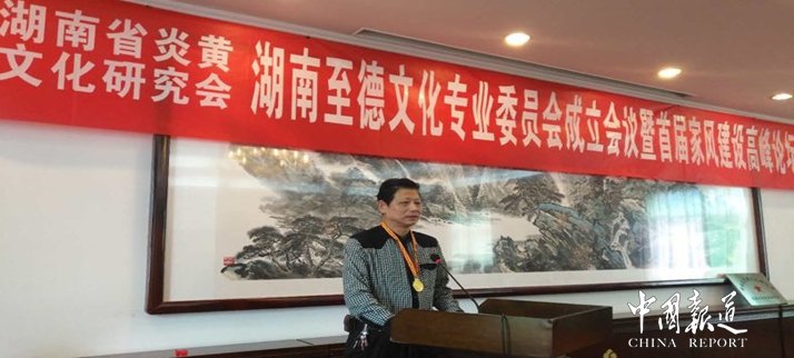 中国报道讯(特约采编 吴梅)湖南省炎黄文化研究会主办的湖南至德文化专业委员会成立暨首届家风建设高峰论坛今日(11月22日)在湖南省省委招待所举行,来自贵州、江西、湖北、江苏、怀化、娄底、永州、郴州、长沙、衡阳等地60余名专家学者参加了会议。