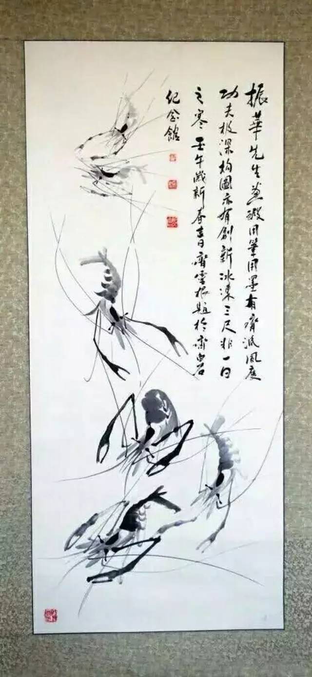 功底雄厚地振华先生秉承白石画虾之风骨,潜心探索。如今,已臻于炉火纯青的境界,将绘画墨分五色运用到笔墨以外的意境中,把白石画虾“一笔三色””的笔法表现得淋漓尽致,一笔下来,他画的虾给人一种通体透明、晶莹逼真之感,使画面产生色彩的变化,完美地表现物象,令人称道。整个作品聚散有法,布局讲究,虽然简单的笔墨线条,却表现出了虾的韵律感,体现出蛟龙的气势。