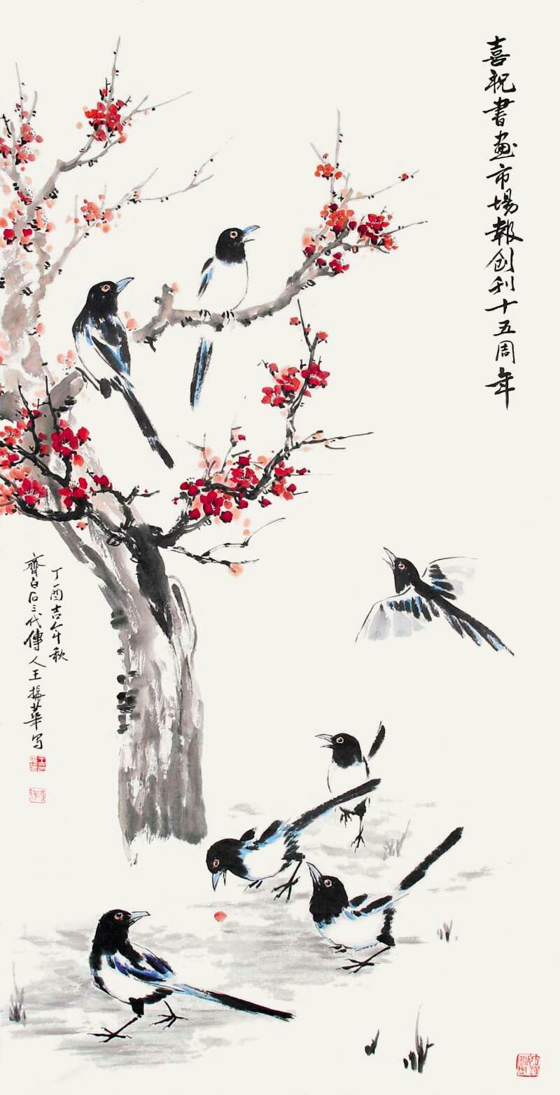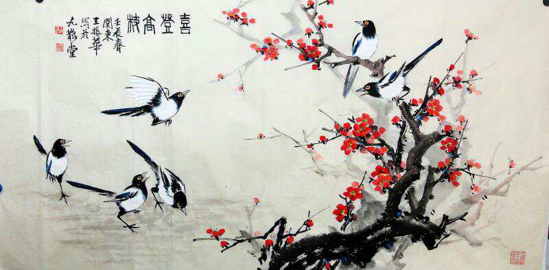 1993年的一天,也是振华先生艺术提升的机缘转折点,偶遇在学校当老师的我国著名绘画大师齐白石的第二代传人王长久先生,王振华感到机不可失,便挑选了十几副画作找到王老师请教拜师,王老师看完振华先生的作品后,赞不绝口,欣然将其纳为入室弟子。他在研习艺术的道路上,得王长久先生口传心授,精心点拨,使悟性极高的振华先生对齐白石大师的艺术真谛有了深刻领悟。为丰富艺术的多元化,又在王老师的建议下,振华先生又开始涉猎画喜鹊等题材。齐白石的:“学我者生,似我者死”名言。让振华先生有了新的思考,虽然成了齐白石第三代传人,更不想就此炫耀自己,他决心探索一条适合自己的艺术之路。记得,宋代大文豪欧阳修曾写过赞美喜鹊的诗句:“鲜鲜毛羽耀明辉,红粉墙头绿树林;日暖风轻言语软,应将喜报主人知。”喜鹊作为吉祥的象征,历来被人们所喜爱。振华先生以前也画过喜鹊,但在王老师的指点下,有了飞跃的进步,不过每次拜访老师都是不厌其烦的给他讲解让之感动!他认真学习细心揣摩,他凭借童年的印迹提笔表意,画作如同进入了苏轼的诗句那样:“牧童弄笛炊烟起,采女谣歌喜鹊鸣”的佳境。振华先生为了实现艺术家的抱负,将自己的画室改成“九鹊堂”。他意味深长地告诉王老师:“北京有荣宝斋,关东有九鹊堂。希望将来从九鹊堂中飞出的喜鹊为天下的人们报平安。”通过振华先生的不懈努力,“关东喜鹊王”的雅号早已在我国艺坛、藏界流传。从此,振华先生工作之余经常到郊外去观察喜鹊,可谓“爬冰卧雪”、“废寝忘食”,几个小时下来腰酸背麻,眼睛酸疼,但他不在乎这些,他注意观察喜鹊的千姿百态,用速写方式将其记录下来。由于细心观察和反复琢磨,所以日后他笔下的喜鹊总以粗笔湿墨,独具神色。清晨遥望碧蓝天空,当人们听到喜鹊清脆的叫声,更是喜上眉梢。喜鹊在民间就有被称之“喜鹊神”、“鹊桥”之美誉。
