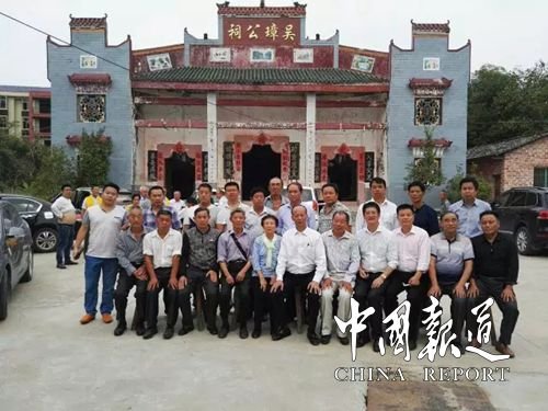 中华吴氏宗亲总会主席吴文富博士、世界吴氏至德总会主席吴希民先生、湖南省宗亲总会会长吴荣华先生在平江土龙村吴璋公祠与大家合影