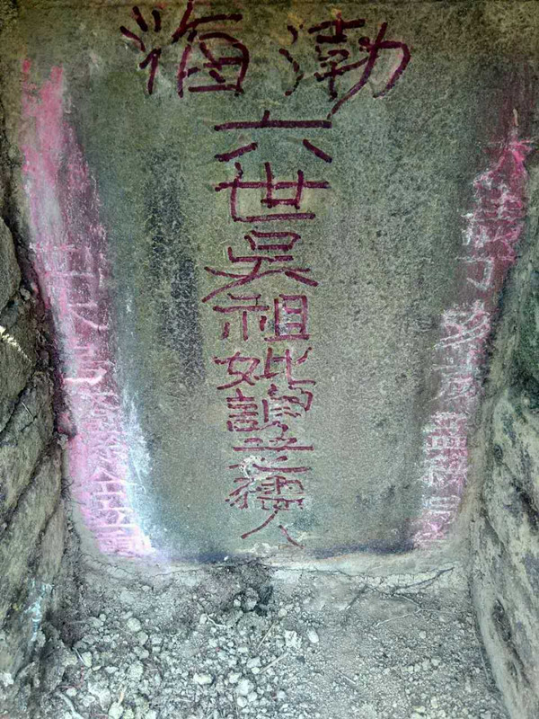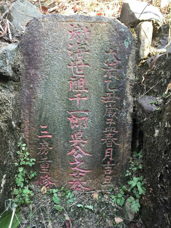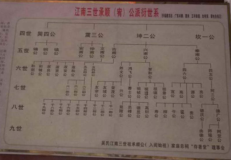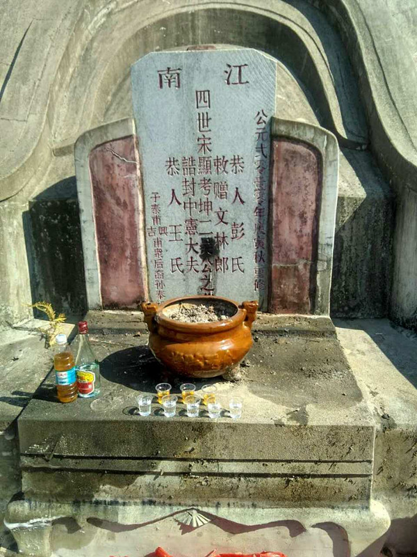 五四郎(泰伯73世),吉甫公之长子,名文偕字友模,为宋进士,居福建永定群萃州,嘉定年间(1208-1224)汀州寇作乱,公因避乱,后徙广东大埔峦州新村(雪坪)。公生于南宋高宗绍兴12年(1142)壬戌7月15日午时,卒于宋理宗绍定2年(1229)已年丑6月11日丑时,享寿88岁。葬于大埔新村断缺背锡坪湖屋后,母坟旁,虎形,壬山丙向。妣张氏,卒葬断缺背黄龙现爪形,癸山丁向。明天启元年(1621年)辛酉十月初十日寅时,千七千八两房及近地嗣孙集议更葬,金骸十有一二。清乾隆十二年(1747年)丁卯十月二十日动工,二十八日竖碑,子山午向兼壬丙分金,此系千七千八公房与永定南门房作主,妣张氏六娘葬新村大岌上桅杆树下猫儿洗面形又号黄龙献爪癸山丁向,碑镌千七千八公名字。永定思贤村朴园公云:前因修张婆太,千八公裔将千八公罐附葬千七公葬,不愿亦将千七公罐附葬,后掘得张婆金埕于坟底,此碑独镌千七千八之由来,永定南门煌甲公,登明崇祯癸卯科进士,竖桅于此,以示荣耀。五四郎妣张氏六娘生九子:千一、千二、千三、千四、千五、千六、千七、千八、千九。