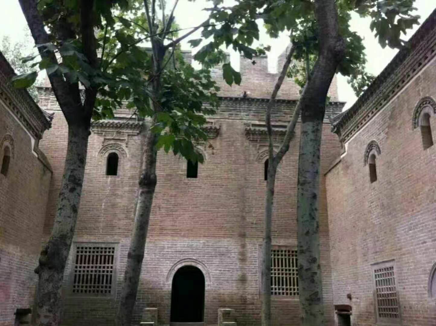 吴家大院简介:吴家大院位于兰考县仪封乡中老君营村,始建于清末,原规模分东、中、西三院,占地3000余平方米。现仅存东院,保存基本完好。该院为四合式院落,东、西长23.36米,南、北长24.18米,占地560余平方米,中轴对称布局,自南向北依次有院门、门廊、东西配房及主楼。院门所处为院落南墙,墙体厚实、高大,高约5.5米,厚0.83米,顶砌垛墙,坚固异常,防御意味浓厚,望之森严。门楣上砖雕“重门燕喜”。门廊为五架悬山式建筑,面阔三面,进深一间。东西配房均为五架梁硬山式建筑,两层,面阔五间,进深一间,未设立柱,梁架直接承于墙体。建筑一层墙体为青砖,二层墙体为土坯外包青砖(俗称里生外熟)。主楼为一座二层平顶式建筑,面阔三间,进深一间,未设柱,梁架直接承于墙体,墙体厚约0.95米。楼顶设女儿墙及垛墙体,四角耸起砖砌尖角,状似皇冠,形制独特。院内建筑均有高大台基,尤其正方台基高约2米。建筑台阶均非传统住宅中的踏步形式,而是便于车辆通行的礓碴。整座院落建筑由南向北依次升高,主次分明,砖雕装饰精美,建筑外观高大宏阔,牢固森严,为清代民居中的罕见实例。2004年9月县政府公布为第三批重点文物保护单位。2016年1月公布为河南省重点文物保护单位。