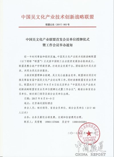 中国报道讯(记者吴蜀丰特约采编 吴宏宇)中国第一家以姓氏命名的产业联盟和公益基金——中国吴文化产业技术创新战略联盟和吴文化公益基金获批今日(2017年8月8)联盟在北京召开了首发会员授牌仪式暨第一届工作会议。