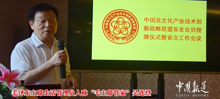 毛泽东主席生活管理员人称“毛主席管家”的吴连登;毛主席警卫处处长、原国家质检总局副局长尹月林;毛主席警卫员、国家副主席汪东兴秘书胡振海,毛主席警卫员、保管员﹑原煤炭部行政处处长张正午;原中央办公厅文献研究室主任、毛泽东生平研究组组长高风;原外交部驻法总领事、线察哈尔学会秘书长张国斌;原中组部老干局局长王莉;毛泽东警卫员、八一电影制片厂军教片部原副主任刘纪春,毛主席警卫中队指导员,原解放军305医院政治委员王明富,毛泽东专列列车长、书法家李建新,毛主席、周总理等中央领导同志的服务员侯桂珍,国家质检总局离退休干部局局长赵兴斌,中科投资董事长吴晓平等有关领导出席本次会议。同时中国吴文化产业技术创新战略联盟理事会聘请担任联盟首届主席团成员,吴连登为主席团副主席,此外国家原副总理吴桂贤担任联盟首届主席团名誉主席。中国报道魅力城乡主编吴蜀丰作为首席媒体执行顾问应邀参加本次会议。中国报道魅力城乡主编吴蜀丰作为首席媒体执行顾问应邀参加本次会议。