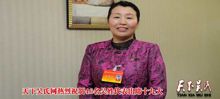 作为名门望族的吴家儿女有46名将岀席参加十九大。其中美女代表16名,他们在不同的岗位发挥光和热,不仅是吴氏的骄傲和荣幸!永远值得我们学习!学习!再学习!十九大吴姓代表,他(她)们分别是,吴兰(女)、吴坚吴狄吴飏吴娜(女)、吴彬(女)、吴焰吴锦吴静(女)、吴一戎吴夕明吴少勋吴中兰(女)、吴水根(苗族)、吴凤杰(女,蒙古族)、吴书香(女,锡伯族)、吴玉良吴汉圣吴亚男吴亚琴(女)、吴协恩吴存荣吴远芳(女,壮族)、吴志明吴秀玲(女)、吴社洲、吴英杰、吴杰明、吴明明(女)、吴政隆、吴相琴(女)、吴信宝、吴胜利、吴洪芹(女)、吴统文吴桂英(女)、吴晓光吴晓红(女)、吴海涛吴海鹰(女,回族)、吴敏霞(女)、吴朝晖吴锦高吴鹏飞吴靖平吴德军。现附其简历如下;