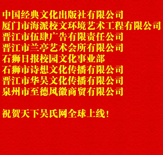 中国经典文化出版社有限公司 厦门市海派校文环境艺术工程有限公司 晋江市伍肆广告有限责任公司 晋江市兰亭艺术会所有限公司 石狮日报校园文化事业部 石狮市诗想文化传播有限公司 晋江市华吴文化传播有限公司 泉州市至德风徽商贸有限公司 祝贺天下吴氏网全球上线!