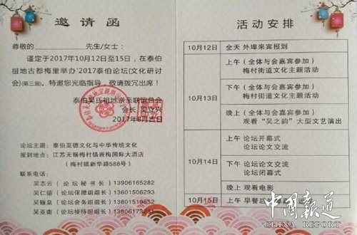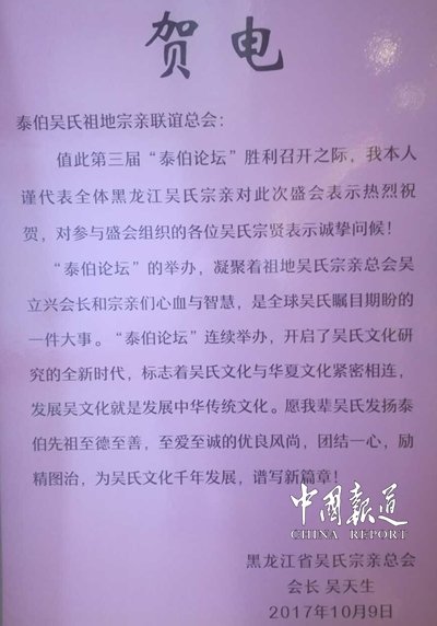 2017年10月12日—15日在这大好的日子里,华夏生肖博物馆、至德世系姓氏文化园揭牌“梅村——岐山”寻根之旅线路开通仪式,以及泰伯论坛交流盛会。在吴氏祖地无锡梅村隆重举行,来自海内外、港澳台、全国各地的专家学者欢聚一堂,探讨至德文化。这次泰伯论坛由泰伯吴氏祖地宗亲联谊总会主办。论坛主题:泰伯至德文化与中华传统文化。至德文化是充满活力的中华传统文化。至德文化源头深远,它是一门古老的中华文化,是对三千二百多年的中华德文化的传承和发扬光大,与当今社会和平发展理念一脉相承,具有强大的生命力,需要继续提倡。人类文明起源于最先是道德文明。近年来,全国各地民间往来、文化交流、经贸合作日益密切。通过论坛平台,把宗亲文化、吴文化、至德文化等中华传统文化在海内外、港澳台、全国各地宗亲的心目中发扬光大。心心相印,心心相连,通过交流论坛互勉互励,共同为中华民族伟大复兴做出贡献。
