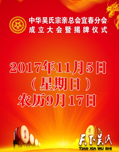天下吴氏讯(特约采编 吴蜀丰 吴程)2017年11月5号上午9点整(星期日)农历9月17日中华吴氏宗亲总会宜春分会(宜春氏三阳吴氏祠堂)揭牌仪式谨邀您参加!期待你的光临指导!参会报名联系人  吴江 18007958768