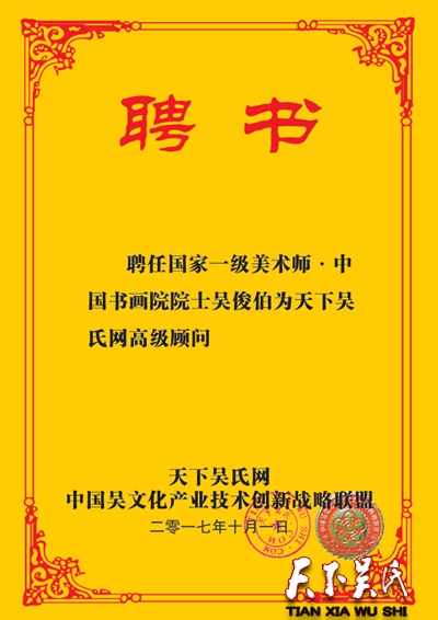 中国书画院院士吴俊伯热烈祝贺天下吴氏网上线