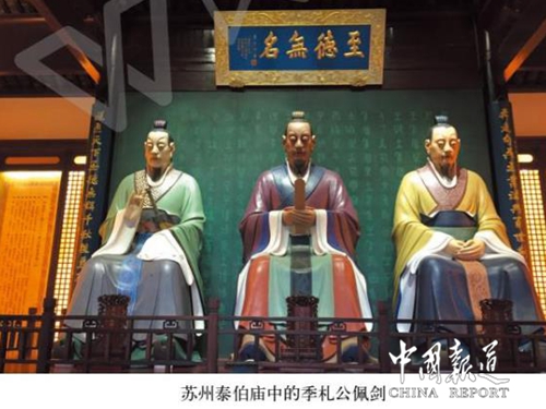 苏州泰伯庙中的季札公佩剑 春秋时期吴国的铸剑技术享誉诸侯各国(剑长42厘米到53厘米不等),各国使节以佩剑作为一种礼义而出访必带,即所谓“君子佩剑”。古人认为剑有君子之德,所以佩剑者是君子。