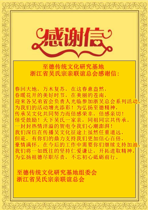 至德传统文化研究基地、浙江省吴氏宗亲联谊总会感谢信