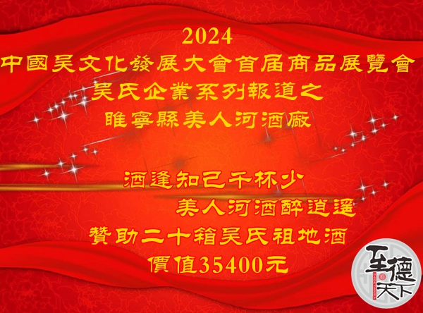 吴梦城的捐赠之举,也为社会树立了榜样。他用实际行动诠释了企业社会责任的内涵,展示了企业家的担当和奉献精神。这种精神将激励更多的人关注和参与到文化传承和社会发展中来。同时,这一捐赠行为也将对吴文化节产生积极的影响。“吴氏祖地酒”将成为文化节的一大亮点,吸引更多的人了解和关注吴文化。此外,这一善举还将促进吴氏家族之间的凝聚力和认同感,加强家族成员之间的联系和交流。总之,睢宁县美人河酒厂吴梦城董事长的捐赠行为具有深远的意义。它不仅彰显了对吴文化的传承和弘扬,也体现了企业的社会责任和爱心。希望这一善举能够激发更多人的积极性,共同推动吴文化的发展和传承,为社会的进步和发展做出贡献。让我们一起为吴梦城的善举点赞,共同期待 2024 年吴文化发展大会无锡吴文化节的成功举办!