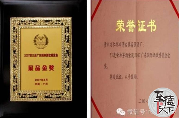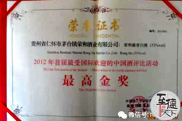 2012年12月20日在美国纽约举办的 “首届最受国际欢迎的中国酒评比活动” 中荣和酱香白酒获得“最高金奖”。