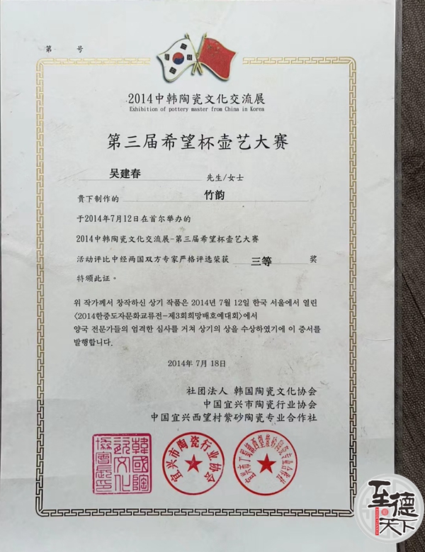 2002年,吴建春工艺美术设计师,创意设计制作的紫砂全自动自流壶诞生,此壶获得多项大奖。环渤海新闻、中国养生文化报等多家媒体做过报道。其中中国文化报记着墨轩的《紫砂文化精神的延伸》一文,对紫砂民间名家吴建春及其夫人优秀陶艺家吉菊仙做了详尽的报道。