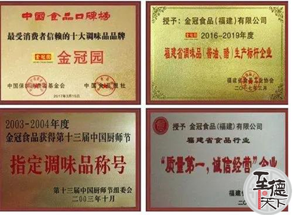 公司秉承“以质量求生存、以信誉求发展、以市场为导向、以服务为己任”的企业宗旨。 坚持以“创新、创优、创名牌”的发展理念,经过多年来的不断努力,先后通过ISO9001国际质量管理体系认证,HACCP食品安全管理体系认证,ISO14001环境管理体系认证和QS认证。在全国同行业中,成为首批获得国家质量安全生产许可证的企业之一,获得“07年中国质量500强”、“省级卫生A级单位”、“国家质量达标食品”、“质量第一,诚信经营企业”、2002年“金冠园”酱油被授予“国家免检产品”称号;获得2003-2004第十叁届中国厨师节指定调味品称号;同时公司也注重品牌建设,“金冠园”牌先后获得“中国驰名商标”、“中国星火计划项目”、“全国食品工业龙头食品企业”、“食品卫生A级单位”、“中国名牌产品”、“中国星火计划产品”、“工商企业信用良好企业”、省市“先进企业”等荣誉称号。产品畅销全国各地并大量出口,深受广大消费者青睐。