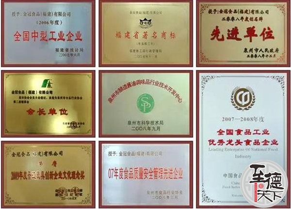 实施品牌战略是公司全面提升核心竞争力的又一重要手段。在公司决策层的高度重视和指导下,深入开展争创品牌活动,使得品牌意识也深入人心。品牌的准则和要求贯穿于各部门,各环节的具体工作中,有效地促进了工作质量和效率,促进了公司绩效的全面提升。2004年荣获“国家免检产品”、2005年荣获“中国驰名商标”。2006年荣获“全国食品工业优秀龙头食品企业”、“福建省优秀龙头食品企业”,2007年荣获“品牌泉州公众印象奖”,自2002年首批通过国家质量安全生产许可证,2003年荣获“福建省著名商标”、首批A级卫生单位、“十三届中国厨师节指定调味品”、多次评为“质量稳定产品”、“质量第一、诚信第一”企业、获得泉州市第一批“卫生安全食品”称号、“工商信用良好”企业等称号。
