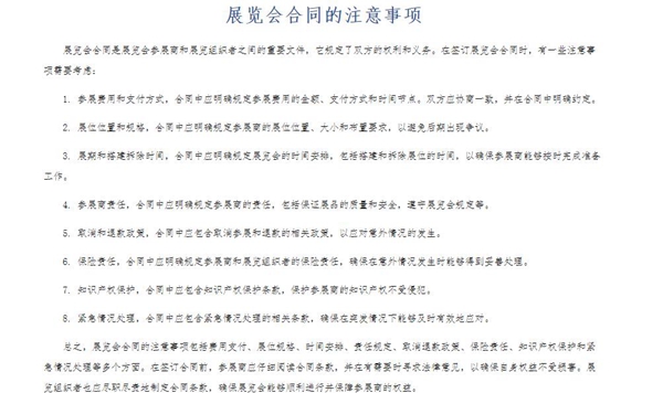 总之,在签订展览会合同时,应认真审查合同主体资格、形式和内容、纠纷解决方式、对方履约能力等方面,确保合同条款的合法性和有效性。同时,在履行合同过程中,应遵守合同约定并保留相关证据,以维护自己的合法权益。