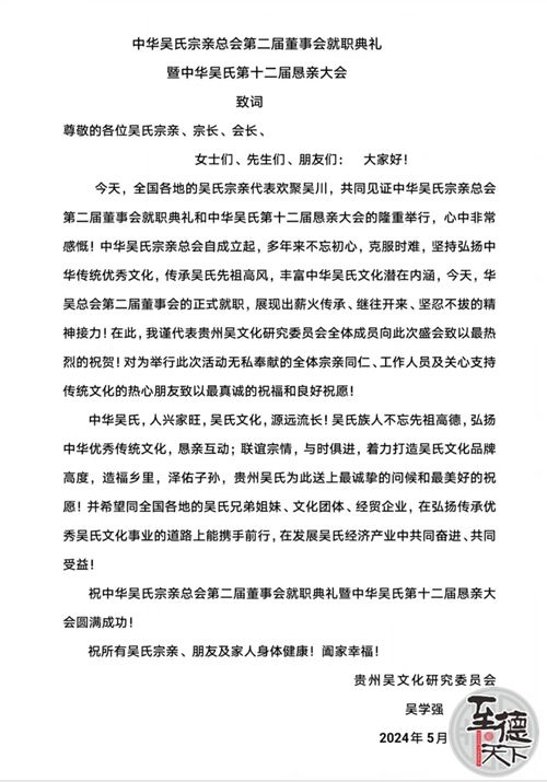 吴学强在致词中说,今天,全国各地的吴氏宗亲代表欢聚吴川,共同见证中华吴氏宗亲总会第二届董事会就职典礼和中华吴氏第十二届恳亲大会的隆重举行,心中非常感慨!中华吴氏宗亲总会自成立起多年来不忘初心,克服时难,坚持弘扬中华传统优秀文化,传承吴氏先祖高风,丰富中华吴氏文化潜在内涵,今天,华吴总会第二届董事会的正式就职,展现出薪火传承、继往开来、坚忍不拔的精神接力!在此,我谨代表贵州吴文化研究委员会全体成员向此次盛会致以最热烈的祝贺。