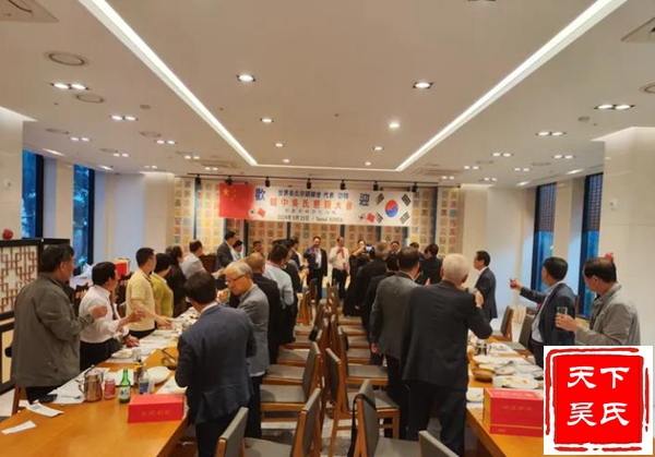 休息片刻,便乘坐大巴车至“韩彩堂”参加为恳亲团一行举办的欢迎晚宴。晚宴上,恳亲团一行得到了韩国吴氏宗亲总会会长吴永泽,监事吴寿南、吴英豪,事务长吴决周、吴时昌,副会长吴昊铉、吴富泳、吴景锡、吴锡奎、吴白宁、吴兴培、吴寿康、吴锡甫、吴玉姬、吴范燮,理事吴东奂、吴育焕、吴承勋、吴东锡、吴广秀等20多位宗亲,以及翻译李贵男、金美兰的热烈欢迎与盛情接待。