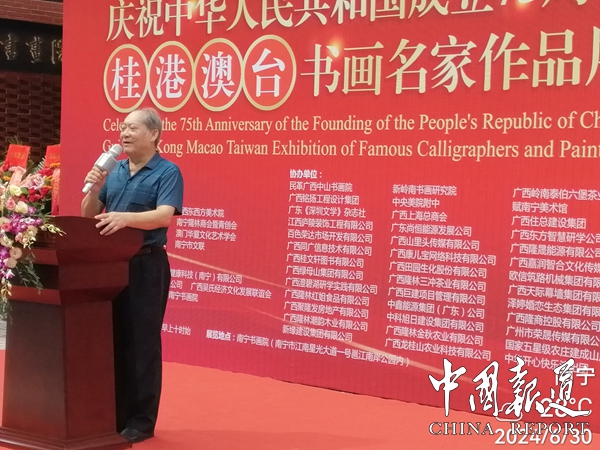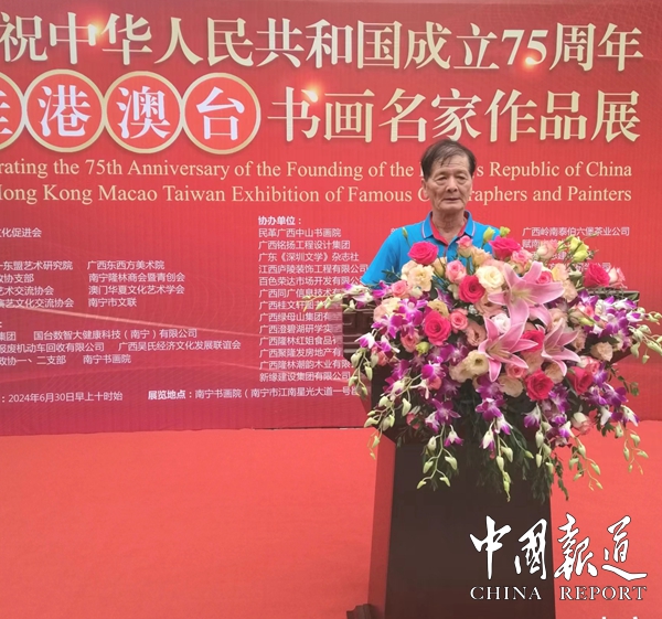 中国报道讯(吴蜀丰报道)6 月 30 日,广西南宁书画院洋溢着浓厚的喜庆氛围,一场隆重的书法展览活动在此盛大举行,以纪念建国 75 周年。此次活动意义非凡,广西岭南泰伯六堡茶业有限公司党支部,及广西吴氏经济文化发展联谊会第三届会长吴茂柏受邀参加这次活动。在活动中与广西壮族自治区原政协副主席黄道伟亲切交谈文化艺术的传承。随后和老领导及港澳台书法家们一起参观了有关作品。