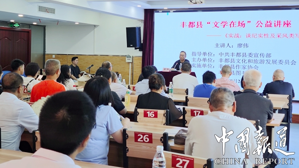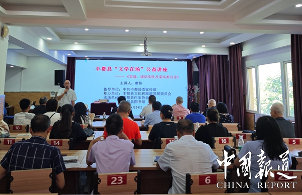 中国报道讯(通讯员代雨门)8月24日,重报集团都市报党委委员、编委,重庆晨报副总编辑,重庆市新闻媒体作协副主席廖伟应丰都县作家协会邀请,到丰都县图书馆举办 “文学在场”公益讲座。丰都县作家协会全体在丰会员、石柱县作家协会部分会员、丰都县图书馆部分工作人员共计40余人参加了讲座。