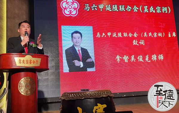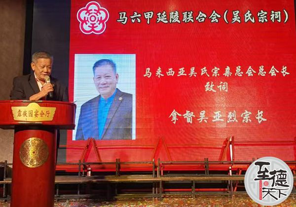 该会会长拿督吴俊兑在致词中说,今晚宴会主题是"吾力全开,共创輝煌",他说"本宗祠於不久之前剛修缮宗祠位於三宝山的公墓,不仅是为了祭拜和缅怀先辈,更是为了传承宗族文化,弘扬先贤美德,我们宗亲文明孝悌,宗族兴旺发达。"同时, 他也盛赞青年团和妇女组,在这短短几年之间在马六甲展开各项活动,例如主办多项慈善与食物库活动,協助社区百户贫老等。尤其这没的会庆,前前后后,青年团和妇女组都落力而忘我的參予各项布置与接待工作。
