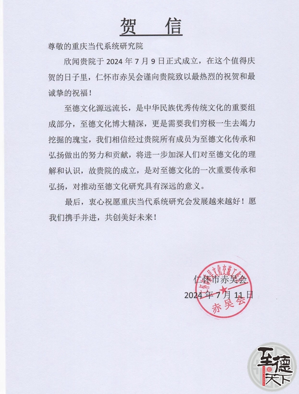 仁怀市赤吴总会致重庆至德文化系统研究基地贺电