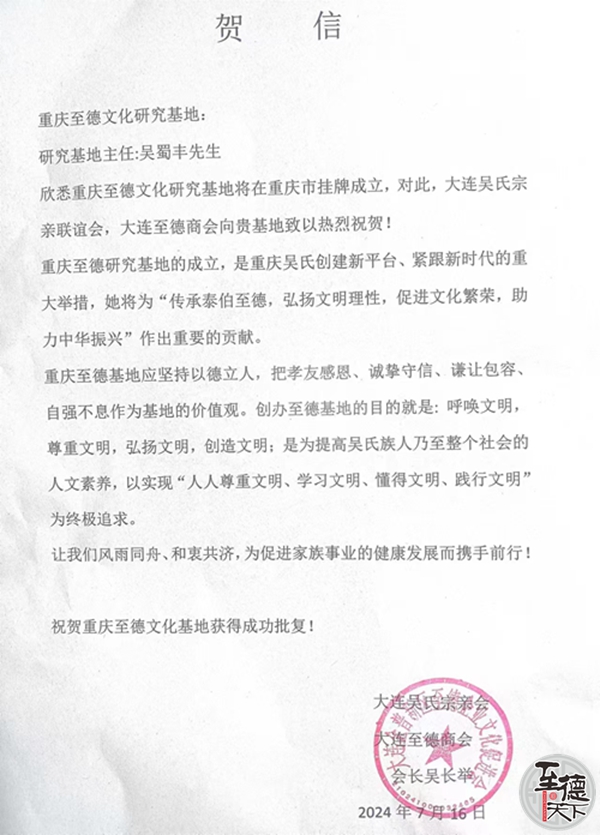 大连吴氏宗亲会 大连至德商会致重庆至德文化系统研究基地贺电