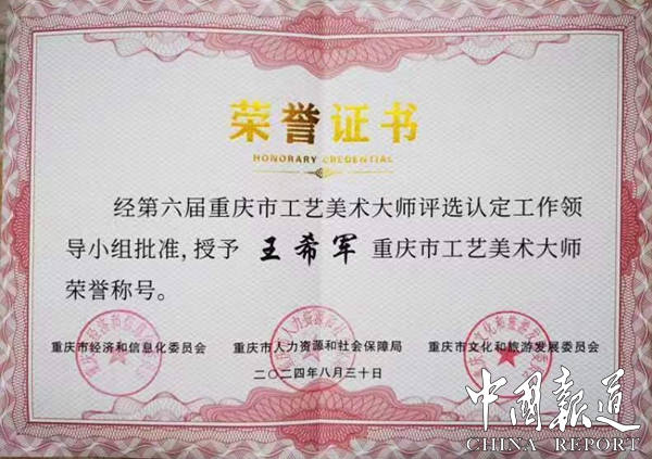 据了解,重庆市工艺美术大师评选至今已成功举办六届,这一荣誉称号是授予重庆市工艺美术领域专业技术人员的至高荣誉,更是对艺术家能力和水平的权威肯定。王希军先生此番载誉,他以军人的坚毅、学者的睿智、艺术家的才情,在陶艺之路上留下了一串串坚实的脚印,无疑是其艺术造诣与社会影响力的有力证明。