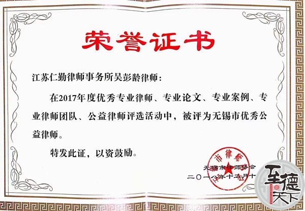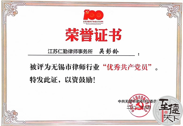 多年来,吴彭龄获得过省、市、区级政府法制、复议应诉、法制宣传、执法监督和多个政府部门先进个人和区优秀党员、先进个人等多次奖励。吴彭龄律师撰写的《从政府败诉论依法行政》等论文曾获市以上法学论文一、二、三等奖,参加的《无锡市第三届宪法宣传周法律知识竞赛》等竞赛获市以上多类法律知识竞赛一、二、三等奖,2017年获“无锡市十佳少年先锋队志愿辅导员”,2018年12月获无锡市律师协会2017年度无锡市优秀公益律师,2020年被无锡市委网信办聘为2020年无锡市网信普法专任讲师,2021年获无锡市律师行业优秀共产党员,2022年获无锡市“七五”普法先进个人,2023年被聘江苏省公共法律服务人才库成员。吴彭龄律师能胜任办理民事、行政诉讼案件和刑事案件,尤其擅长担任各级政府和相关企事业单位的法律顾问,参与协商、谈判、调解和见证,能主持各类大型活动,尤其擅长法治宣传、讲解或培训。