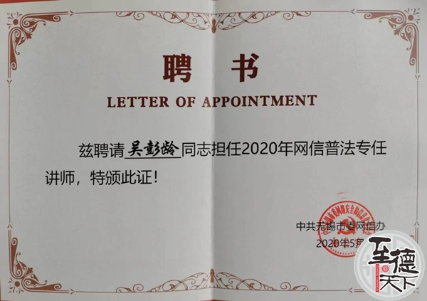 利用微信、视频号、抖音进行吴(泰伯)文化宣传和法律宣传。抖音普法单个视频最大浏览量达500万人次。积极参加社区、街道、区(市、县)、市、省及国家级各类公益法律活动,退而不休,用余热为祖国的法治建设不忘初心、砥砺前行!