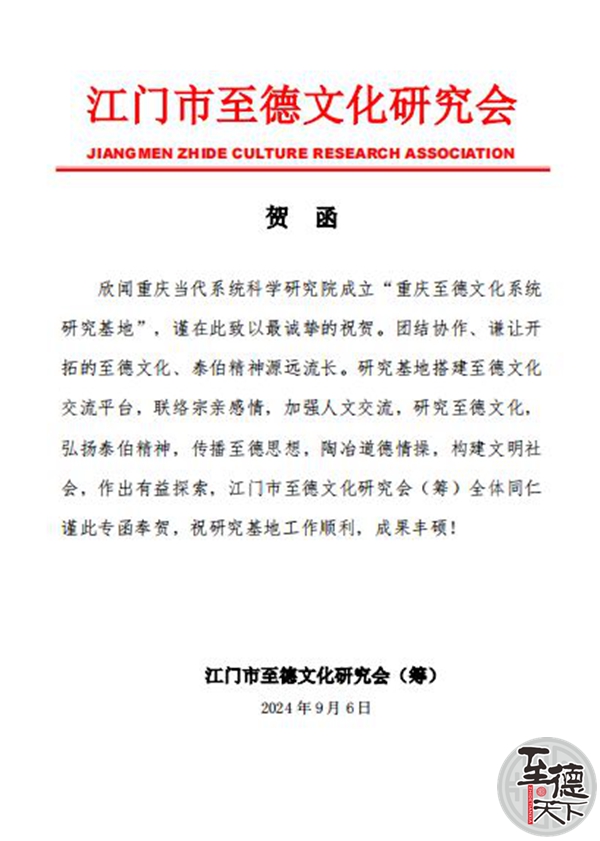 广东江门市至德文化研究会致重庆至德文化系统研究基地贺信