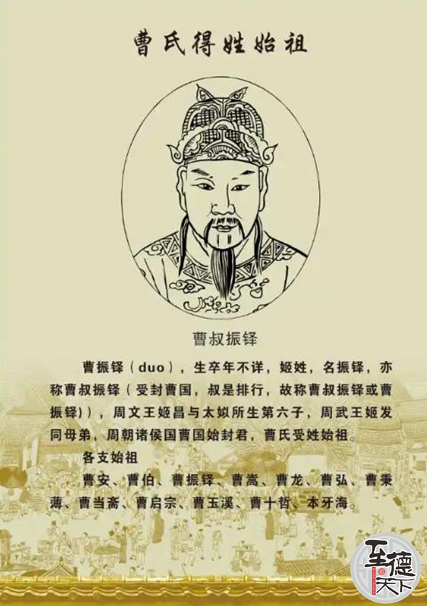 曹叔振铎是中华曹姓的始祖,从公元前1046年到公元1949年的2995年间,他的后人中出现很多具有远见卓识的政治家,军事家,科学家,文学家。其中,有帝王、总统级的人物有32个,宰相、首辅级的人物25位。到目前,全国的曹字冠名州县区镇村2万多处,曹姓人口达730多万。在全球曹姓人口遍布各大洲,曹氏“三多堂”早在100多年前,就与日本、俄罗斯、法国、英国等国家地区开展经商活动。
