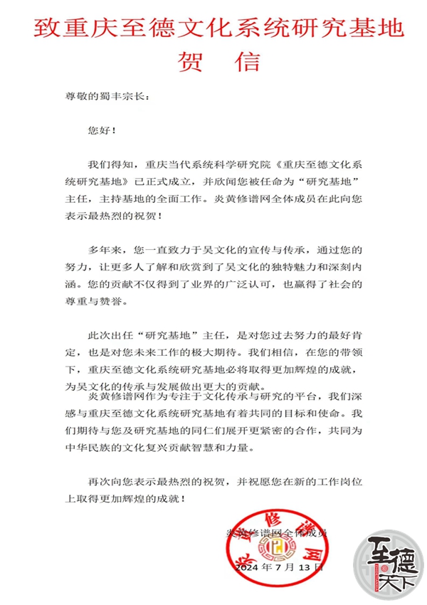 炎黄修谱网致重庆至德文化研究基地贺信