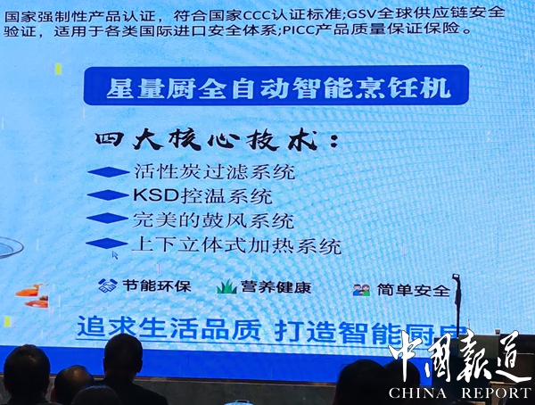 在现场,浙江星耀仁工生物科技有限公司董事长王建兴及相关负责人在会发布会上重点分享该公司推出的星量厨智能炒菜机将创新走进千家万户的思路,引领现代化厨房升级。活性炭过滤系统,KSD控温系统,完全的鼓风系统,上下立体式加热系统,这四大核心枝术成为星量厨智能炒菜机可信懒的品质保证,不仅节能环保而且营养健康,简单安全,如现场烤肉仅16分钟,将土豆丝及配料放入锅中自动翻炒仅2分钟熟了,无论是煲汤、还是炒回锅肉、蒸饭等全智能化,看不见油烟。