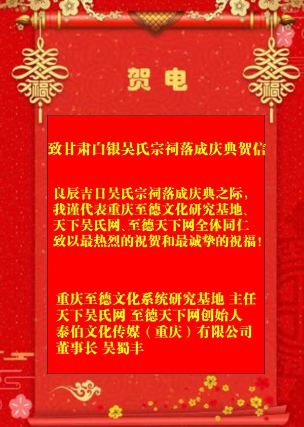 重庆至德文化研究基地致甘肃白银吴氏宗祠落成庆典贺信