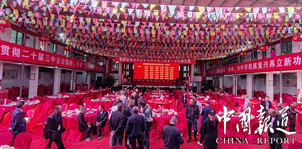 今天的宕顶村,张灯结彩,披上了节日的盛装。每个人的脸上都充满了喜悦和自信,大家敞开着胸怀,喜气洋洋地围坐在丰盛的宴席旁,共享这美好而又温情的盛会与时光。祠堂内彩旗高挂,气氛热烈;主席台前盆景簇拥,绿意盎然。“浙江省苍南宕顶吴氏宗亲会第五届第一次代表大会”的会标正堂悬挂,与祠堂两侧悬挂的“贯彻二十届三中全会精神,开创‘文明宕顶’建设新局面”、“弘扬泰伯公‘开拓谦让’精神,为中华民族复兴再立新功”的两条横幅交相辉映,彰显着宕顶吴氏“听党话、跟党走、爱家乡、兴中华”的豪迈气概和价值取向。