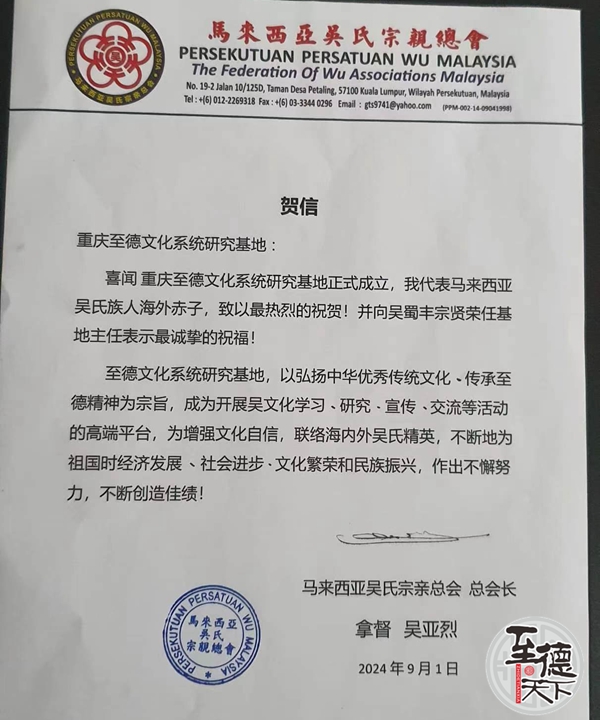 马来西亚吴氏宗亲总会致重庆至德文化系统研究基地贺信