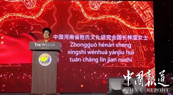 中国河南省姓氏文化研究会代表团团长林坚女士在大会上致辞。她说,河南省姓氏文化研究会以传承和弘扬中华优秀传统文化为己任,二十九年来,凝心聚力从事姓氏文化研究,出版了《中原寻根——源于河南千家姓》、《新编百家姓》、《豫闽台姓氏源流》、《中华姓氏河南寻根》(四卷本)、《黄帝与中华姓氏》、《河洛文化与姓氏文化》、《中华姜姓源流与太公文化研究》等一大批书籍和《历史文化研究》会刊。在培根铸魂、推动姓氏文化创造性转化和创新性发展上下了大功夫,建起新郑“黄帝故里”、卫辉“比干庙”、洛阳“中华丘氏总祠”、伊川“二程文化园”、固始“根亲文化园”、鲁山“中华刘姓始祖苑”、息县“古赖国文化园”、荥阳“郑氏名人苑”等一批全球华人根亲文化圣地和创新文化高地,为海内外中华儿女寻根拜祖提供了切实有力的服务。