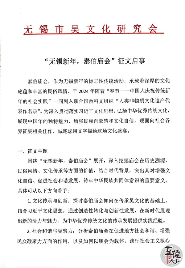 无锡市吴文化研究会“无锡新年,泰伯庙会”征文启事