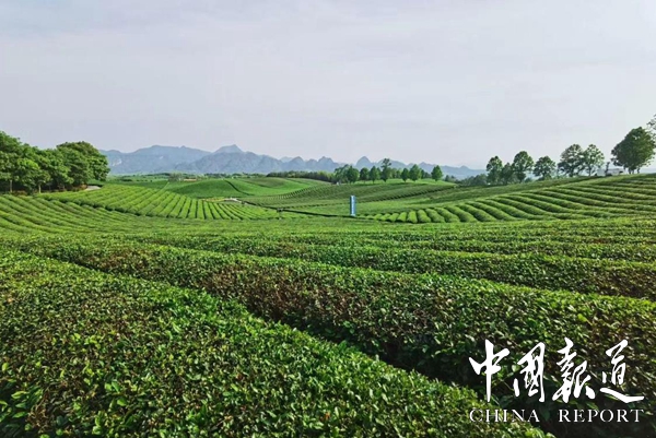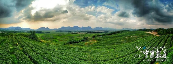 广东翠岭映云霞,东风轻拂醒芳华。英德绿茶香满园,德馨品高传天下。茶韵悠长沁心脾,趣满人间乐无暇,园中胜景醉游人。
