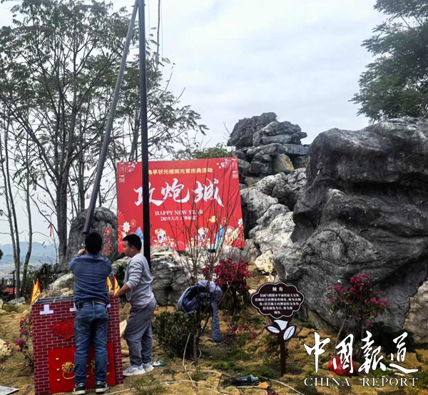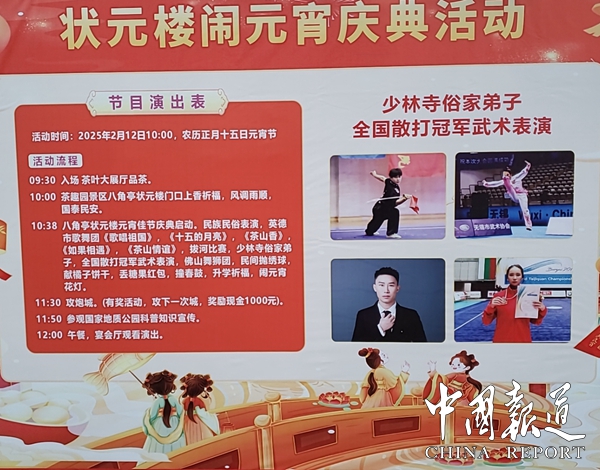 9:08 主持人到位、佛山狮队队在茶园办公门口进行舞狮的采青。9:30 舞狮队到展厅门口进行采青。09:50 全体人员到状元楼八角亭进行点香祈福,上亭舞狮,高桩采青。10:38 所有与会人员集中在状元楼,先”状元楼”和”捐款芳名榜”及”中建三局项目工程立牌”举行揭牌仪式。八角亭门口致词,唱歌表演,舞术表演,拔河比赛,11 :00 10对夫妇带小孩上3楼撞春鼓,拿红包100元。11:18 三楼发元宵节绣球,糖果活动。11:38 点烧攻城炮活动,发糖果红包最大1000元/个,最小5元/个,共91红包。11:50 全体人员在舞狮队的带领下到大茶壶进行高桩采青,之后一齐走红金砖道,观看学习地质公园科普知识,前往宴会厅。12:18 宴会厅,公司领导或股东致词,开香槟、狮头上台舞狮、唱歌表演篝火起动。(图文/吴天下 姚雯璐 吴庆尚)