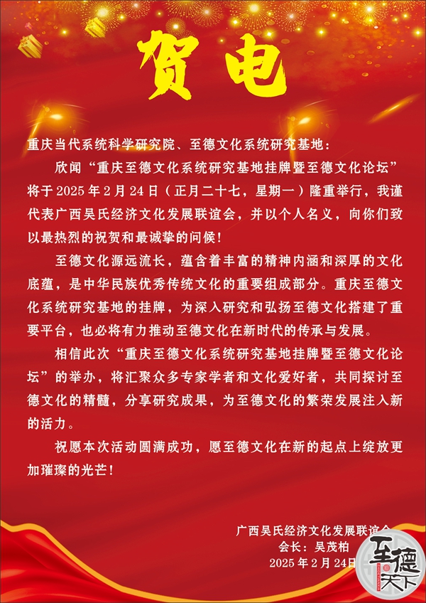 欣闻“重庆至德文化系统研究基地挂牌暨挂牌暨《至德天下》创刊号首发式”将于 2025年2月24日(正月二十七,星期一)隆重举行,我谨代表广西吴氏经济文化发展联谊会,并以个人名义,向你们致以最热烈的祝贺和最诚挚的问候!