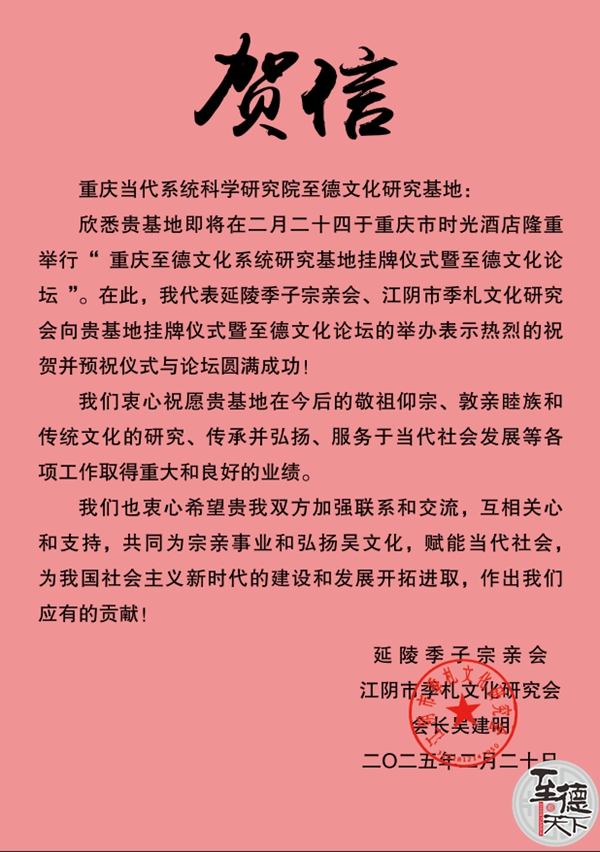 延陵季子宗亲会江阴市文化研究会致重庆当代系统科学研究院至德文化研究基地贺信